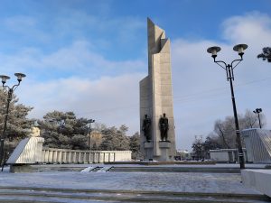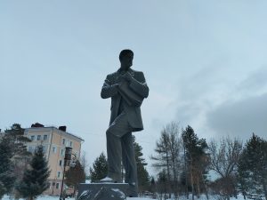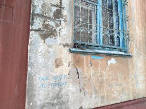 Сюда я уже прогулялся с Алексеем. Вообще, Омск славится двумя известными людьми, это Ева Элфи и Егор Летов. На доме нет ни памятной таблички, ни хоть какого-то упоминания о нём. Нашлась только полустёртая надпись «Всё идёт по плану» и увядшие цветы.
